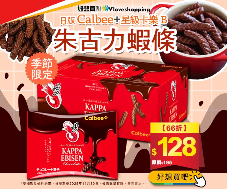 [66折 快閃]【Calbee+ 朱古力蝦條】日版Calbee+ 星級卡樂B Kappa Ebisen 季節限定 朱古力 蝦條禮盒 (1盒6包)