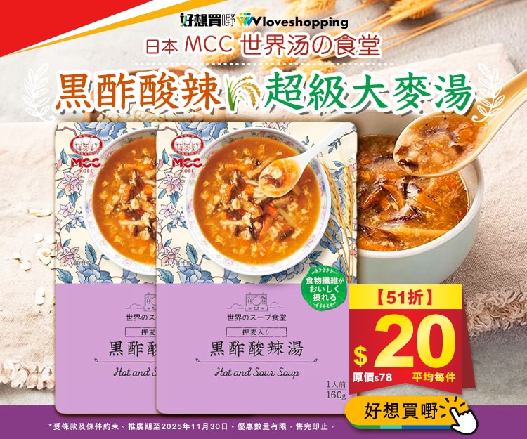 [51折 快閃]【日本MCC 超級大麥 泰式酸辣冬蔭功湯】日本Mcc 世界の湯食堂 超級大麥 泰式酸辣冬蔭功大麥湯 加熱即食湯 160g ($40/2件)