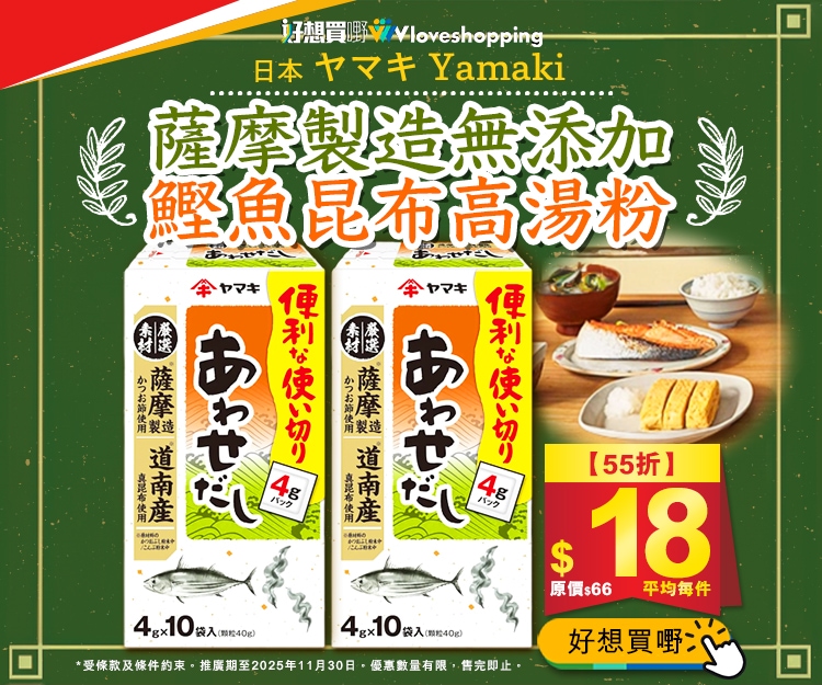 [55折 快閃]【日本Yamaki 無添加 鰹魚昆布高湯粉】日本 ヤマキYamaki 無添加 薩摩製造 鹿兒島鰹魚 及 道南白口浜産 昆布高湯粉 料理調味料 盒裝 (4g×10包) ($36/2件)
